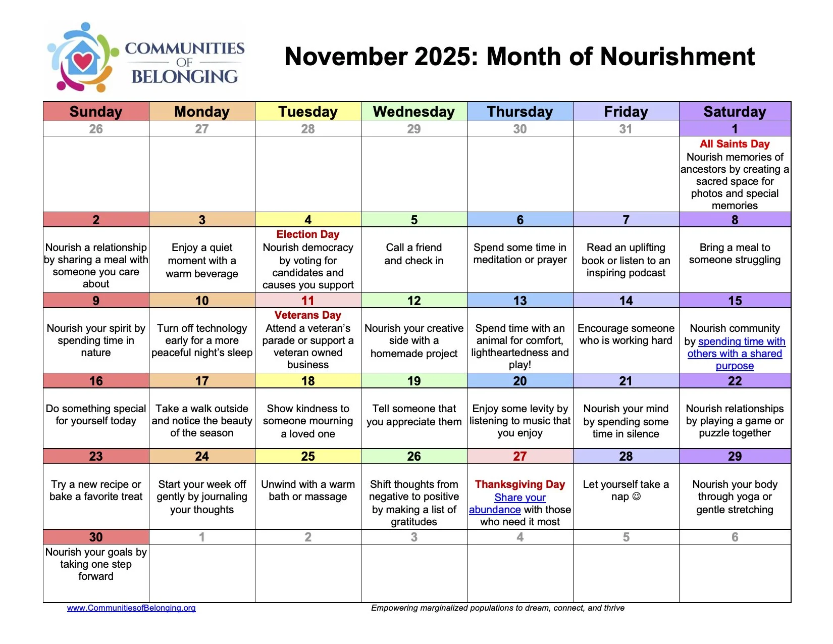 Enjoy a free, themed calendar each month with daily ways to build positivity in yourself, your neighborhood, and the world. Download this month’s calendar by clicking the button below.